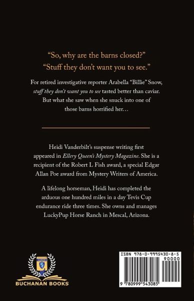 "So, why are the barns closed?" "Stuff they don't want you to see." For retired investigative reporter Arabella "Billie" Snow, stuff they don't want you to see tasted better than caviar. But what she saw when she snuck into one of those barns horrified her... Heidi Vanderbilt's suspense writing first appeared in Ellery Queen's Mystery Magazine. She is a recipient of the Robert L Fish award, a special Edgar Allan Poe award from Mystery Writers of America. A lifelong horseman, Heidi has completed the arduous one hundred miles in a day Tevis Cup endurance ride three times. She owns and manages LuckyPup Horse Ranch in Mescal, Arizona.