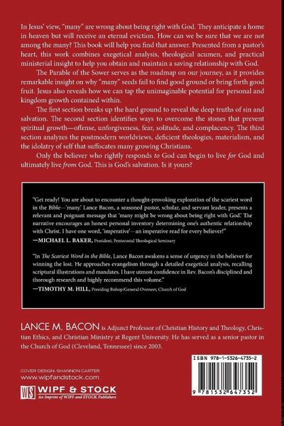In Jesus' view, ""many"" are wrong about being right with God. They anticipate a home in heaven but will receive an eternal eviction. How can we be sure that we are not among the many? This book will help you find that answer. Presented from a pastor's heart, this work combines exegetical analysis, theological acumen, and practical ministerial insight to help you obtain and maintain a saving relationship with God. The Parable of the Sower serves as the roadmap on our journey, as it provides remarkable insight on why ""many"" seeds fail to find good ground or bring forth good fruit. Jesus also reveals how we can tap the unimaginable potential for personal and kingdom growth contained within. The first section breaks up the hard ground to reveal the deep truths of sin and salvation. The second section identifies ways to overcome the stones that prevent spiritual growth--offense, unforgiveness, fear, solitude, and complacency. The third section analyzes the postmodern worldviews, deficient theologies, materialism, and the idolatry of self that suffocates many growing Christians. Only the believer who rightly responds to God can begin to live for God and ultimately live from God. This is God's salvation. Is it yours?