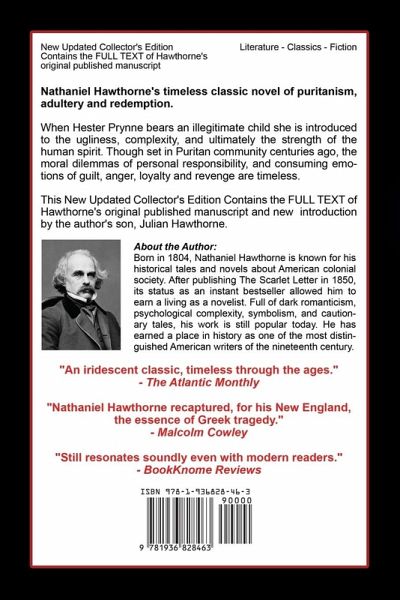 Nathaniel Hawthorne's timeless classic novel of puritanism, adultery and redemption. When Hester Prynne bears an illegitimate child she is introduced to the ugliness, complexity, and ultimately the strength of the human spirit. Though set in Puritan community centuries ago, the moral dilemmas of personal responsibility, and consuming emotions of guilt, anger, loyalty and revenge are timeless. This New Updated Collector's Edition Contains the FULL TEXT of Hawthorne's original published manuscript and new introduction by the author's son, Julian Hawthorne. "An iridescent classic, timeless through the ages " - The Atlantic Monthly "Nathaniel Hawthorne recaptured, for his New England, the essence of Greek tragedy." - Malcolm Cowley "Still resonates soundly even with modern readers" - BookKnome Reviews