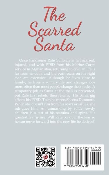 Once handsome Rafe Sullivan is left scarred, injured, and with PTSD from his Marine Corps service in Afghanistan, returning to civilian life is far from smooth, and the burn scars on his right side are extensive. Although he lives close to family, he lives a solitary life and changes jobs more often than most people change their socks. A temporary job as Santa at the mall is presented, but Rafe first rebels, then relents. His Santa gig affects his PTSD. Then he meets Sheena Dunmore. When she doesn't run from his scars or issues, she intrigues him. An unmasking by some rowdy children is a test of his stamina and spirit. His greatest fear is fire. Will Rafe conquer the fear so he can move forward into the new life he desires?