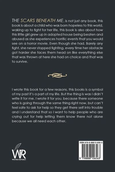 The Scars Beneath Me, is not just any book, this book is about a child who was born hopeless to this world, waking up to fight for her life, this book is also about how this little girl grew up in adopted house being beaten and abused as she experiences horrific events that you would see on a horror movie. Even though she had. Barely any fight, she never stopped fighting, every time her obstacle got harder she faces them head on like everything else that was thrown at here she had on choice and that was to survive.