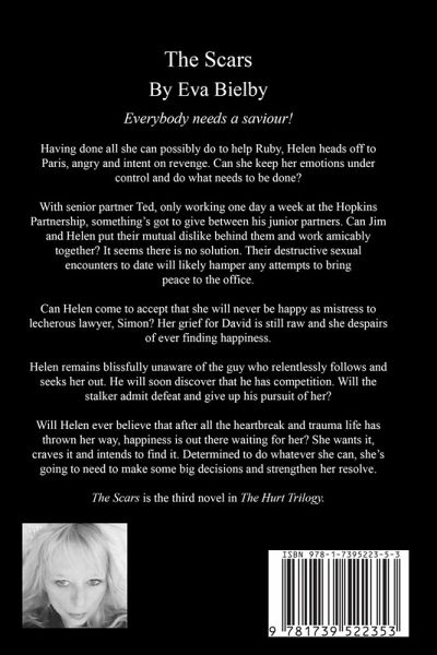 Everybody needs a saviour!Having done all she can possibly do to help Ruby, Helen heads off to Paris, angry and intent on revenge. Can she keep her emotions under control and do what needs to be done?With senior partner Ted, only working one day a week at the Hopkins Partnership, something's got to give between his junior partners. Can Jim and Helen put their mutual dislike behind them and work amicably together? It seems there is no solution. Their destructive sexual encounters to date will likely hamper any attempts to bring peace to the office.Can Helen come to accept that she will never be happy as mistress to lecherous lawyer, Simon? Her grief for David is still raw and she despairs of ever finding happiness. Helen remains blissfully unaware of the guy who relentlessly follows and seeks her out. He will soon discover that he has competition. Will the stalker admit defeat and give up his pursuit of her? Will Helen ever believe that after all the heartbreak and trauma life has thrown her way, happiness is out there waiting for her? She wants it, craves it and intends to find it. Determined to do whatever she can, she's going to need to make some big decisions and strengthen her resolve.The Scars is the third and final part of The Hurt Trilogy