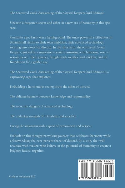 The Scattered Gods: Awakening of the Crystal Keepers (2nd Edition) Unearth a forgotten secret and usher in a new era of harmony in this epic saga. Centuries ago, Earth was a battleground. The once-powerful civilization of Atlantis fell victim to their own ambition, their advanced technology twisting into a tool for discord. In the aftermath, the scattered Crystal Keepers, guided by a mysterious crystal resonating with harmony, rose to restore peace. Their journey, fraught with sacrifice and wisdom, laid the foundation for a golden age. Now, a golden age teeters on the edge of a new discovery. Generations have passed, and the Crystal Keepers are revered elders. Sustainable cities thrive, technology serves humanity, and the scars of the past seem a distant memory. However, a secret truth weighs heavily on them - the story of Atlantis. Knowledge can be a weapon. When a young scholar unearths whispers of a lost civilization, the Crystal Keepers face a critical decision. Revealing the truth of Atlantis could ignite fear and paranoia, jeopardizing the fragile harmony they've built. Yet, keeping it hidden leaves future generations vulnerable to repeating the same mistakes. As humanity prepares for its first interstellar voyage, a chilling question emerges. Will the spirit of harmony travel with them amongst the stars, or will the alluring darkness of the past resurface? The answer lies in the past, in the lessons learned from Atlantis and the unwavering belief in the power of unity. The Scattered Gods: Awakening of the Crystal Keepers (2nd Edition) is a captivating saga that explores: Rebuilding a harmonious society from the ashes of discord The delicate balance between knowledge and responsibility The seductive dangers of advanced technology The enduring strength of friendship and sacrifice Facing the unknown with a spirit of exploration and respect Embark on this thought-provoking journey that celebrates harmony while acknowledging the ever-present threat of discord. It's a story that will resonate with readers who believe in the potential of humanity to create a brighter future, together.