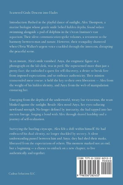 Scattered Gods: Descent into Hades Introduction: Bathed in the playful dance of sunlight, Alex Thompson, a marine biologist whose gentle smile belied hidden depths, found solace swimming alongside a pod of dolphins in the Ocean Institute's vast aquarium. Their silent communication spoke volumes, a testament to the harmony between man and nature. However, their tranquility shattered when Olivia Walker's urgent voice crackled through the intercom, disrupting the peaceful scene. Rushing into the bustling research lab, Alex was met by Olivia's worried expression, her sharp features etched with concern as she pointed to a pulsating red dot on a holographic map beneath New York City. "Anya," Olivia declared, her tone strained, "Her energy signature is fading." Standing beside her, Diana Archer, a picture of athleticism and focus, mirrored Olivia's apprehension. In an instant, Alex's smile vanished. Anya, the enigmatic figure in a photograph on the lab desk, was in peril. She represented more than just a pretty face; she embodied a quest for self-discovery, a desire to break free from imposed expectations, and to embrace authenticity. Their mission transcended mere rescue; it held the key to their own liberation - Alex from the weight of his hidden identity, and Anya from the web of manipulation ensnaring her. Emerging from the depths of the underworld, weary but victorious, the team blinked against the sunlight. Beside Alex stood Anya, her eyes radiating newfound strength. No longer defined by insecurity, she had tapped into her ancient lineage, forging a bond with Alex through shared hardship and a journey of self-realization. Surveying the bustling cityscape, Alex felt a shift within himself. He had embraced his dual identity, no longer shackled by secrecy. A silent understanding passed between him and Anya; they had shed their masks, liberated from the expectations of others. This moment marked not an end, but a beginning - a chance to embark on a new chapter, to live authentically and together.