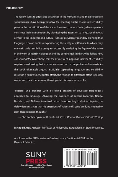 Brings the figure of the voice and the problem of mimesis in Heidegger and post-Heideggerian continental thought to bear on the dismissal of language by the affective and aesthetic turns of contemporary critical theory.