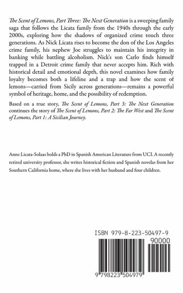 Los Angeles crime boss Nick Licata's expanding empire threatens to consume his own family. As his influence grows, so does his determination to draw nephew Joe and son Carlo into the underworld. Caught between family loyalty and moral conscience, Joe and Carlo battle personal demons of alcoholism and failed marriages while resisting the pull of organized crime. The Scent of Lemons, Part 3: The Next Generation continues this true saga of family, power, and the cost of inherited sins. Based on a true story, The Scent of Lemons, Part 3: The Next Generation continues the story of The Scent of Lemons, Part 2: The Far West and The Scent of Lemons, Part 1: A Sicilian Journey.