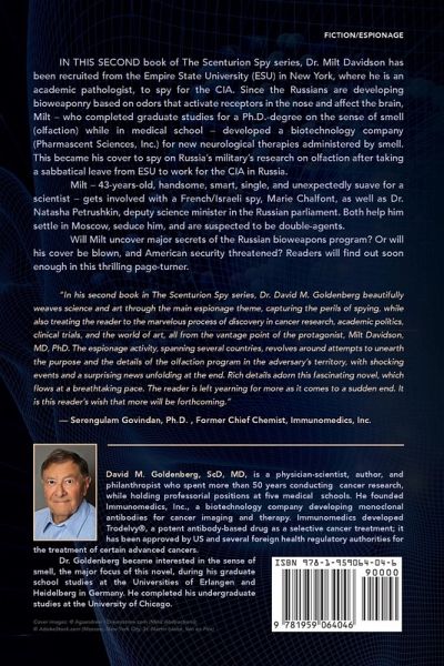 IN THIS SECOND book of The Scenturion Spy series, Dr. Milt Davidson has been recruited from the Empire State University (ESU) in New York, where he is an academic pathologist, to spy for the CIA. Since the Russians are developing bioweaponry based on odors that activate receptors in the nose and affect the brain, Milt - who completed graduate studies for a Ph.D.-degree on the sense of smell (olfaction) while in medical school - developed a biotechnology company (Pharmascent Sciences, Inc.) for new neurological therapies administered via smell. This became his cover to spy on Russia's military's research on olfaction after taking a sabbatical leave from ESU to work for the CIA. Milt - 43-year-old, handsome, smart, single, and unexpectedly suave for a scientist - gets involved with a French/Israeli spy, Marie Chalfont, as well as Dr. Natasha Petrushkin, a deputy science minister in the Russian parliament. Both help him settle in Moscow, seduce him, and are suspected of being double-agents. The book begins with Milt secretly escaping to St. Martin, where Marie is hiding from the Hezbollah, having assassinated one of their leaders. In Moscow, Milt spies on the Russian olfactory bioweaponry research program through both scientific pretexts and some seduction tactics of his own. Will Milt uncover major secrets of the Russian bioweaponry program? Or will his cover be blown, and American security threatened? Readers will find out soon enough in this thrilling page-turner. David Goldenberg, MD, a recognized leader in the field of cancer research, has written an absorbing and exciting novel encompassing his extensive scientific knowledge and a rich imagination in the area of global spying. Romance and intrigue keep the reader wondering how this scientist, traveling between Russia, New York and Israel, is going to manage his scientific endeavors and complicated love entanglements. All seem to blend, if not seamlessly, then at least without too many hiccups. Murder and a surprise ending makes for a good, interesting read! I recommend it. - Ruthi Zinn Byrne Zinn Graves & Field Marketing & Public Relations Florham Park NJ 07932