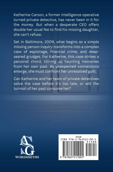 Katherine Carson, a former intelligence operative turned private detective, has never been in it for the money. But when a desperate CEO offers double her usual fee to find his missing daughter, she can't refuse. Set in Baltimore, 2009, what begins as a simple missing person inquiry transforms into a complex case of espionage, financial crime, and deep-seated grudges. For Katherine, this case strikes a personal chord, stirring up haunting memories from her own past. As unexpected connections emerge, she must confront her unresolved guilt. Can Katherine and her team of private detectives solve the case before it's too late, or will the turmoil of her past consume her?