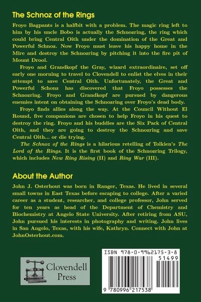 Froyo Bagpants is a halfbit with a problem. The magic ring left to him by his uncle Bobo is actually the Schnozring, the ring which could bring Central Oith under the domination of the Great and Powerful Schnoz. Now Froyo must leave his happy home in the Mire and destroy the Schnozring by pitching it into the fire pit of Mount Drool. Froyo and Grandkopf the Gray, wizard extraordinaire, set off early one morning to travel to Clovendell to enlist the elves in their attempt to save Central Oith. Unfortunately, the Great and Powerful Schonz has discovered that Froyo possesses the Schnozring. Froyo and Grandkopf are pursued by dangerous enemies intent on obtaining the Schnozring over Froyo's dead body. Froyo finds allies along the way. At the Council Without El Round, five companions are chosen to help Froyo in his quest to destroy the ring. Froyo and his buddies are the Six Pack of Central Oith, and they are going to destroy the Schnozring and save Central Oith... or die trying. The Schnoz of the Rings is a hilarious retelling of Tolkien's The Lord of the Rings. It is the first book of the Schnozring Trilogy, which includes New Ring Rising (II) and Ring War (III).