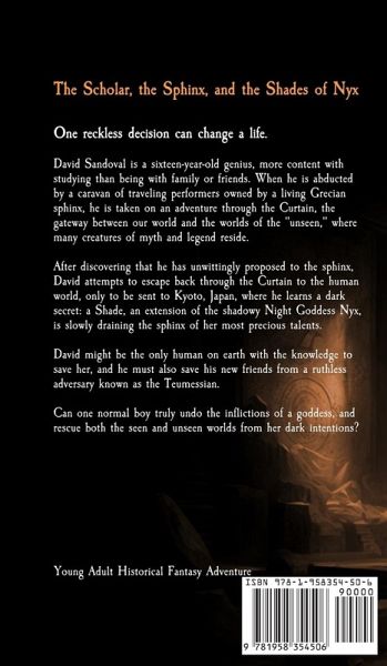 One reckless decision can change a life. David Sandoval is a sixteen-year-old genius, more content with studying than being with family or friends. When he is abducted by a gypsy caravan owned by a living Grecian sphinx, he is taken on an adventure through the Curtain, the gateway between our world and the worlds of the "unseen," where many creatures of myth and legend reside. After discovering that he has unwittingly proposed to the sphinx, David attempts to escape back through the Curtain to the human world, only to be sent to Kyoto, Japan, where he learns a dark secret: a Shade, an extension of the shadowy Night Goddess Nyx, is slowly draining the sphinx of her most precious talents. David might be the only human on earth with the knowledge to save her, and he must also save his new friends from a ruthless adversary known as the Teumessian. Can one normal boy truly undo the inflictions of a goddess, and rescue both the seen and unseen worlds from her dark intentions?