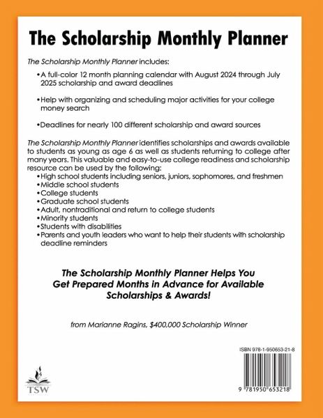 The Scholarship Monthly Planner 2024-2025 identifies scholarships and awards available to students as young as age 6 as well as students returning to college after many years. This valuable and easy-to-use college readiness and scholarship resource, updated yearly in August, can be used by the following:High school students including seniors, juniors, sophomores, and freshmen Middle school students College students Graduate school students Adult and nontraditional students Minority students Students with disabilities First generation students Parents and youth leaders who want to help their students with scholarship deadline reminders The Scholarship Monthly Planner Helps You Get Prepared Months in Advance for Available Scholarships and Awards!