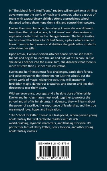 In "The School for Gifted Teens," readers will embark on a thrilling adventure into the world of magic and wonder, where a group of teens with extraordinary abilities attend a prestigious school designed to help them hone their skills and control their powers. Evelyn, the main character, has always known she was different from the other kids at school, but it wasn't until she receives a mysterious letter that her life changes forever. The letter invites her to attend the School for Gifted Teens, a place where she can learn to master her powers and abilities alongside other students who share her gifts. Upon arrival, Evelyn is sorted into her house, where she makes friends and begins to learn the ins and outs of the school. But as she delves deeper into the curriculum, she discovers that there is more at stake than just her own education. Evelyn and her friends must face challenges, battle dark forces, and solve mysteries that threaten not just the school, but the entire world of magic. Along the way, they will encounter forbidden magic, dangerous creatures, and secrets and lies that threaten to tear them apart. With perseverance, courage, and a healthy dose of friendship, Evelyn and her classmates must work together to protect the school and all of its inhabitants. In doing so, they will learn about the power of sacrifice, the importance of leadership, and the true meaning of love, hope, and inspiration. "The School for Gifted Teens" is a fast-paced, action-packed young adult fantasy that will captivate readers with its rich world-building, dynamic characters, and thrilling storyline. It's perfect for fans of Harry Potter, Percy Jackson, and other young adult fantasy classics.