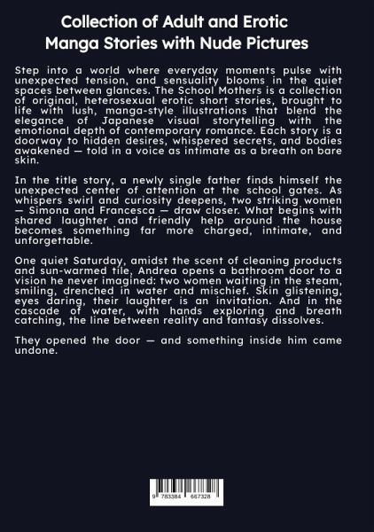 Step into a world where everyday moments pulse with unexpected tension, and sensuality blooms in the quiet spaces between glances. The School Mothers is a collection of original, heterosexual erotic short stories, brought to life with lush, manga-style illustrations that blend the elegance of Japanese visual storytelling with the emotional depth of contemporary romance. Each story is a doorway to hidden desires, whispered secrets, and bodies awakened - told in a voice as intimate as a breath on bare skin.In the title story, a newly single father finds himself the unexpected center of attention at the school gates. As whispers swirl and curiosity deepens, two striking women - Simona and Francesca - draw closer. What begins with shared laughter and friendly help around the house becomes something far more charged, intimate, and unforgettable.One quiet Saturday, amidst the scent of cleaning products and sun-warmed tile, Andrea opens a bathroom door to a vision he never imagined: twowomen waiting in the steam, smiling, drenched in water and mischief. Skin glistening, eyes daring, their laughter is an invitation. And in the cascade of water, with hands exploring and breath catching, the line between reality and fantasy dissolves.They opened the door - and something inside him came undone.