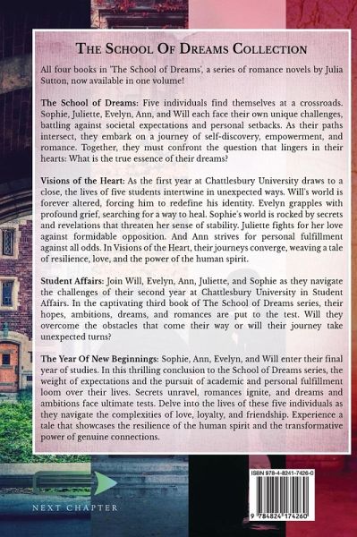 All four books in 'The School of Dreams', a series of romance novels by Julia Sutton, now available in one volume! The School of Dreams: Five individuals find themselves at a crossroads. Sophie, Juliette, Evelyn, Ann, and Will each face their own unique challenges, battling against societal expectations and personal setbacks. As their paths intersect, they embark on a journey of self-discovery, empowerment, and romance. Together, they must confront the question that lingers in their hearts: What is the true essence of their dreams? Visions of the Heart: As the first year at Chattlesbury University draws to a close, the lives of five students intertwine in unexpected ways. Will's world is forever altered, forcing him to redefine his identity. Evelyn grapples with profound grief, searching for a way to heal. Sophie's world is rocked by secrets and revelations that threaten her sense of stability. Juliette fights for her love against formidable opposition. And Ann strives for personal fulfillment against all odds. In Visions of the Heart, their journeys converge, weaving a tale of resilience, love, and the power of the human spirit. Student Affairs: Join Will, Evelyn, Ann, Juliette, and Sophie as they navigate the challenges of their second year at Chattlesbury University in Student Affairs. In the captivating third book of The School of Dreams series, their hopes, ambitions, dreams, and romances are put to the test. Will they overcome the obstacles that come their way or will their journey take unexpected turns? The Year Of New Beginnings: Sophie, Ann, Evelyn, and Will enter their final year of studies. In this thrilling conclusion to the School of Dreams series, the weight of expectations and the pursuit of academic and personal fulfillment loom over their lives. Secrets unravel, romances ignite, and dreams and ambitions face ultimate tests. Delve into the lives of these five individuals as they navigate the complexities of love, loyalty, and friendship. Experience a tale that showcases the resilience of the human spirit and the transformative power of genuine connections.