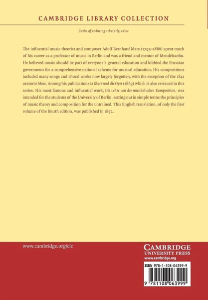 Adolf Bernhard Marx (1795-1866), influential music theorist, composer and friend of Mendelssohn, believed music should be part of everyone's education. This English translation, of only the first volume of the fourth edition of his influential work on the principles of music theory and composition, was first published in 1852.