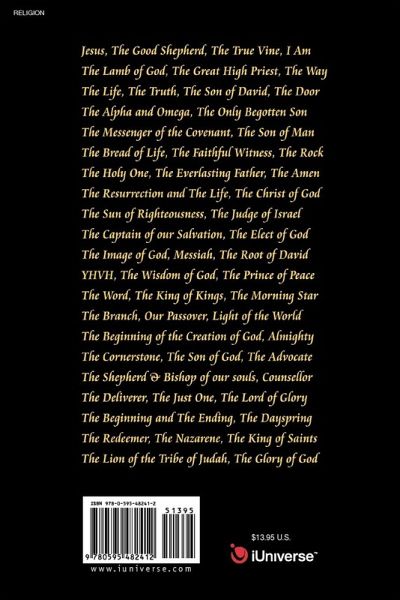 Jesus, The Good Shepherd, The True Vine, I Am The Lamb of God, The Great High Priest, The Way The Life, The Truth, The Son of David, The Door The Alpha and Omega, The Only Begotten Son The Messenger of the Covenant, The Son of Man The Bread of Life, The Faithful Witness, The Rock The Holy One, The Everlasting Father, The Amen The Resurrection and The Life, The Christ of God The Sun of Righteousness, The Judge of Israel The Captain of our Salvation, The Elect of God The Image of God, Messiah, The Root of David YHVH, The Wisdom of God, The Prince of Peace The Word, The King of Kings, The Morning Star The Branch, Our Passover, Light of the World The Beginning of the Creation of God, Almighty The Cornerstone, The Son of God, The Advocate The Shepherd & Bishop of our souls, Counsellor The Deliverer, The Just One, The Lord of Glory The Beginning and The Ending, The Dayspring The Redeemer, The Nazarene, The King of Saints The Lion of the Tribe of Judah, The Glory of God JbY's book investigates different methods of biblical interpretation. Interestingly ben YAHVEH's concept of 'wisdom hath mingled her wine' captures the full essence of the wisdom seeker.