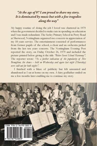 "At the age of 97 I am proud to share my story. It is dominated by music but with a few tragedies along the way"My happy routine of doing the job I loved was shattered in 1979 when the government decided to make cuts in spending on education and I was made redundant. The Seeley Primary School in Perry Road at Sherwood, Nottingham organised two concerts in appreciation of my 18 years service. The entertainment consisted of performances from former pupils of the school, a choir and an orchestra picked from the last ten years concerts. The Nottingham Evening Post reported the story, on Friday October 26, 1979 and included the picture printed below giving it the title "Bitter-Sweet School Harmony". The reporter wrote: "As a further indication of the popularity of Mrs Broughton. the shows - held on Wednesday and again last night (Thursday) were sold out for both nights". I finished with a blaze of publicity but felt unwanted and abandoned as I sat at home on my own. A fairy godfather smiled on me a few months later enabling me to continue my story.