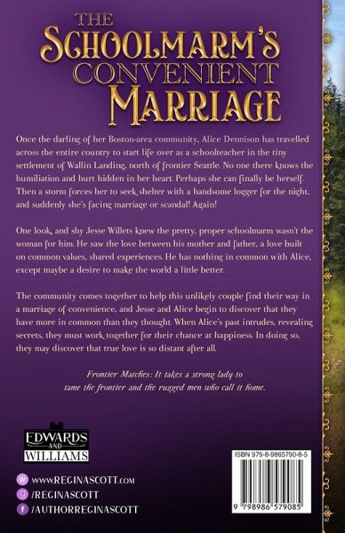 How far would you go to find your true love? Once the darling of her Boston-area community, Alice Dennison has travelled across the entire country to start life over as a schoolteacher in the tiny settlement of Wallin Landing, north of frontier Seattle. No one there knows the humiliation and hurt hidden in her heart. Perhaps she can finally be herself. Then a storm forces her to seek shelter with a handsome logger for the night, and suddenly she's facing marriage or scandal! Again! One look, and shy Jesse Willets knew the pretty, proper schoolmarm wasn't the woman for him. He saw the love between his mother and father, a love built on common values, shared experiences. He has nothing in common with Alice, except maybe a desire to make the world a little better. The community comes together to help this unlikely couple find their way in a marriage of convenience, and Jesse and Alice begin to discover that they have more in common than they thought. When Alice's past intrudes, revealing secrets, they must work together for their chance at happiness. In doing so, they may discover that true love is so distant after all. If you like warm, witty historical romances, then you'll love this frontier romance by an award-winning author. "I LOVE to read Regina Scott's books. They always feel comfortable. I honestly don't know how else to convey how 'at home' I feel when reading what she's written." Hott Book Reviews Fall in love with the frontier, today. Frontier Matches: It takes a strong lady to tame the frontier and the rugged men who call it home.