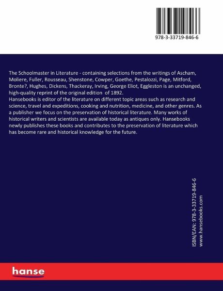 The Schoolmaster in Literature - containing selections from the writings of Ascham, Moliere, Fuller, Rousseau, Shenstone, Cowper, Goethe, Pestalozzi, Page, Mitford, Bronte?, Hughes, Dickens, Thackeray, Irving, George Eliot, Eggleston is an unchanged, high-quality reprint of the original edition of 1892.Hansebooks is editor of the literature on different topic areas such as research and science, travel and expeditions, cooking and nutrition, medicine, and other genres. As a publisher we focus on the preservation of historical literature. Many works of historical writers and scientists are available today as antiques only. Hansebooks newly publishes these books and contributes to the preservation of literature which has become rare and historical knowledge for the future.