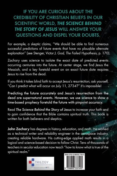 IF YOU ARE CURIOUS ABOUT THE CREDIBILITY OF CHRISTIAN BELIEFS IN OUR SCIENTIFIC WORLD, THE SCIENCE BEHIND THE STORY OF JESUS WILL ANSWER YOUR QUESTIONS AND DISPEL YOUR DOUBTS. For example, a skeptic claims, "We should be able to find numerous successful predictions of future events that have no plausible alternate explanation" (see Stenger, Victor J. God, The Failed Hypothesis, pg. 170). Zachary uses science to isolate the exact date of predicted events occurring centuries into the future. At center stage, we find Jesus the Messiah, and a key foretold event on an exact future date requires Jesus to rise from the dead. If you think it takes blind faith to accept Jesus's resurrection, ask yourself, "Can I predict what will occur on July 11, 2734?" It's impossible! Predicting the future accurately and Jesus's resurrection from the dead are supernatural evens. However, we use science to show a time-based prophecy foretold the future with pinpoint accuracy. Read The Science Behind the Story of Jesus to increase your faith and to gain confidence that the Bible contains spiritual truth. This book is written for both believers and skeptics.