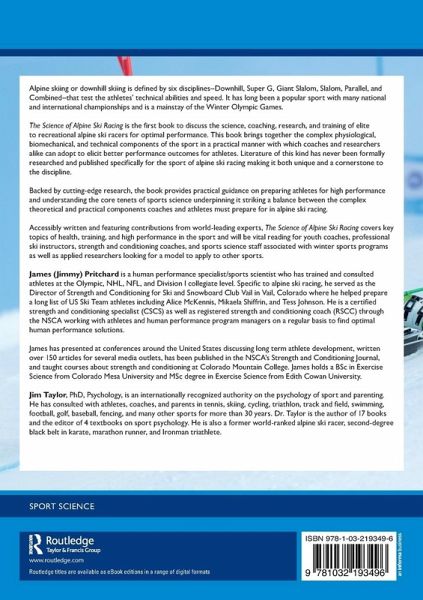The Science of Alpine Ski Racing is the first book to discuss the science, coaching, research, and training of elite to recreational alpine ski racers for optimal performance. This book brings together the complex physiological, biomechanical, and technical components of the sport in a practical manner with which coaches and researchers alike can adopt to elicit better performance outcomes for athletes. Literature of this kind has never been formally researched and published specifically for the sport of alpine ski racing making it both unique and a cornerstone to the discipline.