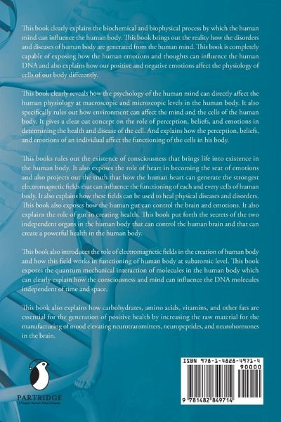 This book clearly explains the biochemical and biophysical process by which the human mind can influence the human body. This book brings out the reality how the disorders and diseases of human body are generated from the human mind. This book is completely capable of exposing how the human emotions and thoughts can influence the human DNA and also explains how our positive and negative emotions affect the physiology of cells of our body differently. This book clearly reveals how the psychology of the human mind can directly affect the human physiology at macroscopic and microscopic levels in the human body. It also specifically rules out how environment can affect the mind and the cells of the human body. It gives a clear cut concept on the role of perception, beliefs, and emotions in determining the health and disease of the cell. And explains how the perception, beliefs, and emotions of an individual affect the functioning of the cells in his body. This books rules out the existence of consciousness that brings life into existence in the human body. It also exposes the role of heart in becoming the seat of emotions and also projects out the truth that how the human heart can generate the strongest electromagnetic fields that can influence the functioning of each and every cells of human body. It also explains how these fields can be used to heal physical diseases and disorders. This book also exposes how the human gut can control the brain and emotions. It also explains the role of gut in creating health. This book put forth the secrets of the two independent organs in the human body that can control the human brain and that can create a powerful health in the human body. This book also introduces the role of electromagnetic fields in the creation of human body and how this field works in functioning of human body at subatomic level. This book exposes the quantum mechanical interaction of molecules in the human body which can clearly explain how the consciousness and mind can influence the DNA molecules independent of time and space. This book also explains how carbohydrates, amino acids, vitamins, and other fats are essential for the generation of positive health by increasing the raw material for the manufacturing of mood elevating neurotransmitters, neuropeptides, and neurohormones in the brain.