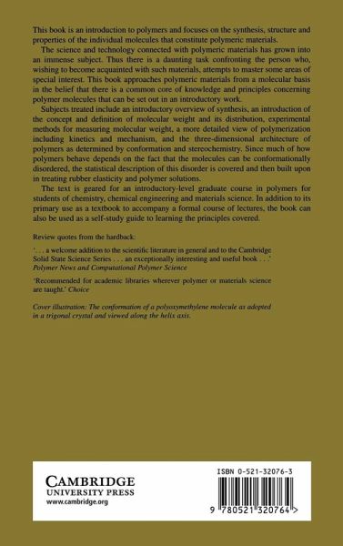This book is an introduction to polymers and focuses on the synthesis, structure and properties of the individual molecules that constitute polymeric materials. It approaches polymeric materials from a molecular basis on the belief that there is a common core of knowledge and principles concerning polymer molecules that can be set out in an introductory work. Subjects treated include an introductory overview of synthesis, an introduction of the concept and definition of molecular weight and its distribution, experimental methods for measuring molecular weight, a more detailed view of polymerization including kinetics and mechanism, and the three-dimensional architecture of polymers as determined by conformation and stereochemistry. The statistical description of the conformational disorder of the molecules is covered and then built upon in treating rubber elasticity and polymer solutions.