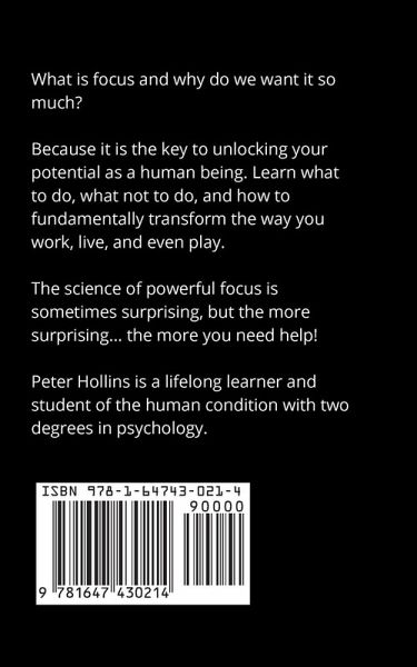 Overhaul your approach to concentration and productivity using strategic, science-proven methods to save hours a day and achieve twice as much. Your current focus and productivity tactics might be "adequate." But they will never be great or reach their potential if you don’t understand how your psychology and physiology work together to affect your focus. Short circuit your brain into instant focus. The Science of Powerful Focus looks at focus in a revolutionary new way, and sheds light on studies both new and old that lead to the path of massive productivity and conquering of goals. It is a holistic view of how focus can be tackled from every angle of a person’s life. Other books will tell you to simply ditch your phone, stop multi-tasking, and sleep more. Is that really helpful information, or is it just common sense? Here, even the concept of focus is re-defined, and you will learn a plethora of actionable ways to integrate science into your daily life. Clear your mind, sit, and grind. Peter Hollins has studied psychology and peak human performance for over a dozen years and is a bestselling author. He has worked with dozens of individuals to unlock their potential and path towards success. His writing draws on his academic, coaching, and research experience. Defeat distractions and get "into the zone" on command. •Master the foundations of discipline and willpower. •Set goals that inevitable. •The biological basis behind procrastination. •Managing energy, your circadian rhythm, and nature’s schedule. Stop procrastinating and do more in half the time. •How to effectively "singletask." •How to prime your mental engine. •To-do lists, priority lists, don’t do lists, and all you need to keep you accountable and on track. Master your focus, master your life. Focus is the most important of real life skills - the ability to accomplish what you want and get things done. A life without focus is a life defined by settling for "good enough." A life with focus is defined by less stress, more success, greater achievements, more money, more goals checked off, and a higher life trajectory.