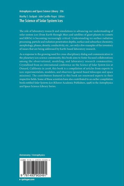 Foreword.- Preface.- Acknowledgements.- Part I - Optical Remote Sensing of Planetary Ices.- Chapter 1: Observed Ices in the Solar System.- Chapter 2: Photometric Properties of Solar System Ices.- Chapter 3: Ultraviolet Properties of Planetary Ices.- Chapter 4: The Ices on Transneptunain Objects and Centaurs.- Part II: Ice Physical Properties and Planetary Applications.- Chapter 5: First-Principles Calculations of Physical Properties of Planetary Ices.- Chapter 6: Frictional Sliding of Cold Ice: A Fundamental Process Underlying Tectonic Activity Within Icy Satellites.- Chapter 7: Planetary Ices Attenuation Properties.- Chapter 8: Deformation Behavior of Ice in Polar Ice Sheets.- Chapter 9: Cratering in Icy Bodies.- Chapter 10: Geology of Icy Bodies.- Part III - Volatiles in Ices.- Chapter 11: Amorphous and Crystalline H 2 O-Ice.- Chapter 12: Clathrate Hydrates: Implications for Exchange Processes in the Outer Solar System.- Chapter 13: Cometary Ices.- Chapter 14: Gas Trapping in Ice and Its Release Upon Warming.- Part IV: Surface Ice Chemistry.- Chapter 15: Chemistry in Ices - From Fundamentals to Planetary Applications.- Chapter 16: Radiation Effects in Water ice in the Outer Solar System.- Chapter 17: Sputtering of Ices.- Chapter 18: Photochemistry in Terrestrial Ices.- Index.