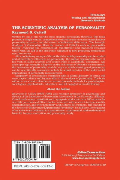 Written by one of the world's most eminent personality theorists, this book provides a simply written, comprehensive introduction to recent research about personality structure and the nature of individual differences. The Scientific Analysis of Personality offers the essence of Cattell's work on personality testing, reviewing the experimental, quantitative and statistical research which with the aid of the electronic computer is now producing remarkable new discoveries. After preliminary surveys of the methods by which personality can be studied and of hereditary influences on personality, the author expounds the core of his work on factor analysis and source traits of excitability, dominance, ego and super-ego strength. Chapters on the techniques of objective measurement, the motivation of personality, and the ways in which learning and growing up can be scientifically assessed conclude in a final overview of the wider social implications of personality measurement. Simplicity of presentation combined with a useful glossary of terms will encourage students and layman alike in the analysis of personality. The book will serve as a basic reference to current research methods for psychologists, sociologists, psychiatrists, educators and all engaged in mental testing.