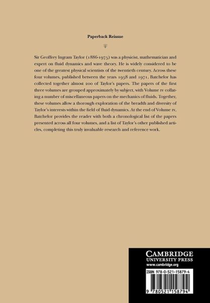 Sir Geoffrey Ingram Taylor (1886-1975) was a physicist, mathematician and expert on fluid dynamics and wave theory. He is widely considered to be one of the greatest physical scientists of the twentieth century. Across these four volumes, published between the years 1958 and 1971, Batchelor has collected together almost 200 of Sir Geoffrey Ingram Taylor's papers. The papers of the first three volumes are grouped approximately by subject, with Volume IV collating a number of miscellaneous papers on the mechanics of fluids. Together, these volumes allow a thorough exploration of the breadth and diversity of Sir Geoffrey Taylor's interests within the field of fluid dynamics. At the end of Volume IV, Batchelor provides the reader with both a chronological list of the papers presented across all four volumes, and a list of Sir Geoffrey Taylor's other published articles, completing this truly invaluable research and reference work.
