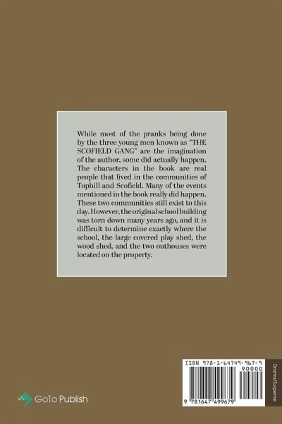 While most of the pranks being done by the three young men known as "THE SCOFIELD GANG" are the imagination of the author, some did actually happen. The characters in the book are real people that lived in the communities of Tophill and Scofield. Many of the events mentioned in the book really did happen. These two communities still exist to this day. However, the original school building was torn down many years ago, and it is difficult to determine exactly where the school, the large covered play shed, the wood shed, and the two outhouses were located on the property. About the Author Mel came from a family of nine children, he being the oldest son. Mel attended this little one room school through grade seven. Over half of the students in Scofield School were either brothers and sisters or first cousins. His teacher for all those years was Erie E. Ditto. Many of the events in this book actually happened. Other events are the imagination of the author. This is the second book Mel has authored. His first book was titled "The Mistry Of Goat Mountain and still available on Amazon.