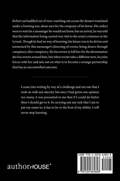 Robert sat huddled out of view, watching out across the dessert wasteland under a burning sun, alone save for the company of his horse. His orders were to wait for a messenger he would not know, but on arrival, he was told that the information being carried was vital to the army’s existence in the Levant. Though he had no way of knowing, his future was to be driven and tormented by this messenger’s directing of events, being drawn through conspiracy after conspiracy. He has sworn to kill her for the abomination she has woven around him, but when events take a different turn, he joins forces with her and sets out on what is to become a strange partnership that has an uncontrolled outcome.