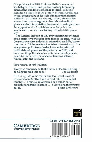 First published in 1973, Professor Kellas' account of Scottish government and politics has long been recognized as the standard textbook in the field. Its scope includes a definition of the Scottish political system, and critical descriptions of Scottish administration, parliamentary activity, parties, electoral behavior, and pressure groups. Scottish nationalism is given a wider interpretation than usual, covering not only the support for the Scottish National Party, but the manifestations of national feeling in Scottish life. The General Election of 1987 provided further evidence of the distinctive character of politics in Scotland. In a new postscript Professor Kellas looks at the principal political developments of the period since 1983, and examines the political and constitutional developments posed by the current imbalance of forces between Westminster and Scotland.
