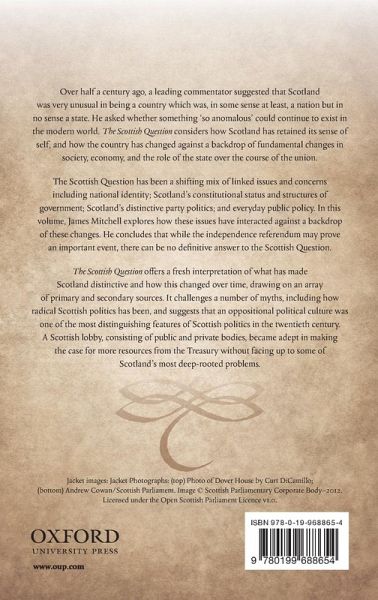 Over half a century ago, a leading commentator suggested that Scotland was very unusual in being a country which was, in some sense at least, a nation but in no sense a state. He asked whether something 'so anomalous' could continue to exist in the modern world. The Scottish Question considers how Scotland has retained its sense of self, and how the country has changed against a backdrop of fundamental changes in society, economy, and the role of the state over the course of the union. The Scottish Question has been a shifting mix of linked issues and concerns including national identity; Scotland's constitutional status and structures of government; Scotland's distinctive party politics; and everyday public policy. In this volume, James Mitchell explores how these issues have interacted against a backdrop of these changes. He concludes that while the independence referendum may prove an important event, there can be no definitive answer to the Scottish Question. The Scottish Question offers a fresh interpretation of what has made Scotland distinctive and how this changed over time, drawing on an array of primary and secondary sources. It challenges a number of myths, including how radical Scottish politics has been, and suggests that an oppositional political culture was one of the most distinguishing features of Scottish politics in the twentieth century. A Scottish lobby, consisting of public and private bodies, became adept in making the case for more resources from the Treasury without facing up to some of Scotland's most deep-rooted problems.