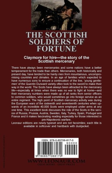 Claymore for hire-the story of the Scottish mercenary There have always been mercenaries and some nations have a better temperament for the trade than others. Mercenaries, both historically and present day, have tended to be hardy men from mountainous, uncompromising countries and climates. In an age of families which expected to have numerous sons to ensure a continuation of the line, 'young gentlemen' of the Quentin Durward variety often took to the sword to make their way in the world. The Scots have always been attracted to the mercenary life-especially at times when there was no war to fight at home-and their mercenary numbers were made up of all ranks from senior officers to common soldiers, who would sometimes go into foreign service as an entire regiment. The high point of Scottish mercenary activity was during the European wars of the sixteenth and seventeenth centuries when upwards of an incredible 40,000 Scots were employed under arms at any one time. This excellent book discusses the role of the Scots in the service of Russia, Prussia, Austria, Sweden, Italy, Turkey, Spain, Portugal and France and it makes fascinating reading especially for those interested in pre-Napoleonic warfare. Leonaur editions are newly typeset and are not facsimiles; each title is available in softcover and hardback with dustjacket.