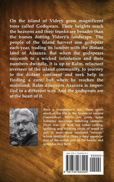 Dean Kinne's debut novel, The Scourge of Godspear, introduces the reader to the island of Vidrey where gigantic trees called godspears, grow. It is here we meet Ralm, heir to the office of overseer. The responsibilities of overseer are vast, encompassing roles of mediator, organizer and leader, all of which Ralm wants nothing to do with. He's content with idling his days in the forests surrounding his island village. Unfortunately, his father Brun, was deposed of his position as overseer and as his only child, Ralm must assume the burdensome title. On Vidrey, grow magnificent trees called Godspears. Their heights reach the heavens and their trunks are broader than the homes dotting Vidrey’s landscape. The people of the island harvest one godspear each year, trading its lumber with the distant land of Azazura. But when the godspears succumb to a wicked infestation and their numbers dwindle, it is up to Ralm, reluctant overseer of the island community, to journey to the distant continent and seek help in finding a cure, but when he reaches the mainland, Ralm discovers Azazura is imperiled in a different way. And the godspears are at the heart of it.
