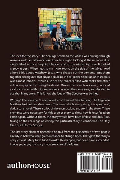 The idea for the story "The Scourge" came to me while I was driving through Arizona and the California desert one late night, looking at the ominous dust clouds filled with circling night hawks against the windy night sky. It looked creepy at best. When I got to my motel room, on the side of the table, I read a holy bible about Matthew, Jesus, who chased out the demons. I put them together and figured that anyone could be in hell, so the selection of characters was almost infinite. I would also see the rail cars filled with tanks and other military equipment crossing the desert. On one memorable occasion, I noticed a rail car loaded with migrant workers crossing the same area, so I decided to use that in my story. This is how the idea of The Scourge was birthed. Writing "The Scourge," I envisioned what it would take to bring The Legion in Matthew back into modern times. This is not a bible study story; it is a profound, dark, scary novel. There is a lot of violence, action, and sex in the story. These elements were necessary for this type of story to show how it resurfaced on Earth again. Without them, the story would have been lifeless and dull. Plus, taking on the challenge of writing this particular story is considered The Holy Grail of all Horror Stories. The last story element needed to be told from the perspective of two people already in hell who were given a chance to change sides. That gave the story a unique twist. Many have tried to make this happen, but none have succeeded. I hope you enjoy my story if you are a fan of darkness.