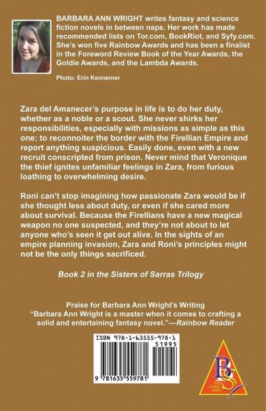 Zara del Amanecer's purpose in life is to do her duty, whether as a noble or a scout. She never shirks her responsibilities, especially with missions as simple as this one: to reconnoiter the border with the Firellian Empire and report anything suspicious. Easily done, even with a new recruit conscripted from prison. Never mind that Veronique the thief ignites unfamiliar feelings in Zara, from furious loathing to overwhelming desire. Roni can't stop imagining how passionate Zara would be if she thought less about duty, or even if she cared more about survival. Because the Firellians have a new magical weapon no one suspected, and they're not about to let anyone who's seen it get out alive. In the sights of an empire planning invasion, Zara and Roni's principles might not be the only things sacrificed. Book 2 in the Sisters of Sarras Trilogy