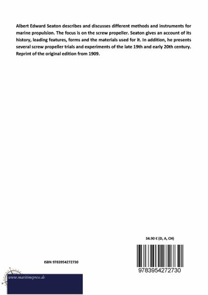 Albert Edward Seaton describes and discusses different methods and instruments for marine propulsion. The focus is on the screw propeller. Seaton gives an account of its history, leading features, forms and the materials used for it. In addition, he presents several screw propeller trials and experiments of the late 19th and early 20th century.