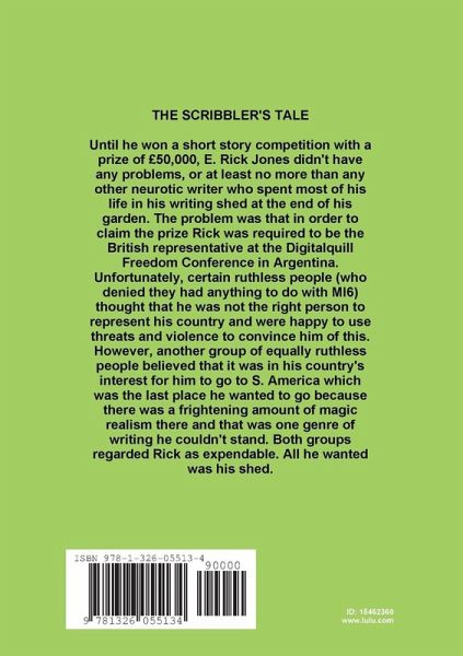 Until he won a short story competition with a prize of £50,000, E. Rick Jones didn't have any problems or at least no more than any other neurotic writer who spent most of his life in his writing shed at the end of his garden. The problem was that in order to claim the prize Rick was required to be the British representative at the Digitalquill Freedom Conference in Argentina. Unfortunately, certain ruthless people (who denied they had anything to do with MI6) thought that he was not the right person to represent his country and were happy to use threats and violence to convince him of this. However, there was another group of equally ruthless people who believed it was in his country's interest for him to go to S. America which was the last place he wanted to go because there was a frightening amount of magic realism there and that was one genre of writing he couldn't stand. Both groups regarded Rick as expendable. All he wanted was his shed.