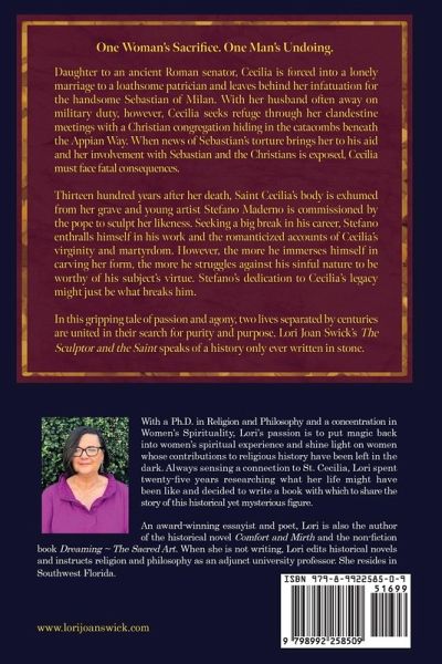 One Woman's Sacrifice. One Man's Undoing.Daughter to an ancient Roman senator, Cecilia is forced into a lonely marriage to a loathsome patrician and leaves behind her infatuation for the handsome Sebastian of Milan. With her husband often away on military duty, however, Cecilia seeks refuge through her clandestine meetings with a Christian congregation hiding in the catacombs beneath the Appian Way. When news of Sebastian's torture brings her to his aid and her involvement with Sebastian and the Christians is exposed, Cecilia must face fatal consequences. Thirteen hundred years after her death, Saint Cecilia's body is exhumed from her grave and young artist Stefano Maderno is commissioned by the pope to sculpt her likeness. Seeking a big break in his career, Stefano enthralls himself in his work and the romanticized accounts of Cecilia's virginity and martyrdom. However, the more he immerses himself in carving her form, the more he struggles against his sinful nature to be worthy of his subject's virtue. Stefano's dedication to Cecilia's legacy might just be what breaks him.In this gripping tale of passion and agony, two lives separated by centuries are united in their search for purity and purpose. Lori Joan Swick's The Sculptor and the Saint speaks of a history only ever written in stone.