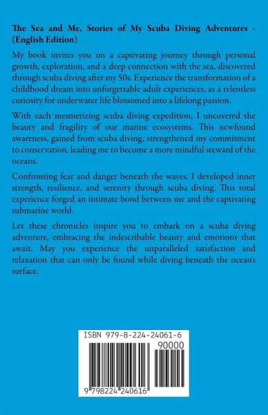 The Sea and Me, Stories of My Scuba Diving Adventures - (English Edition) My book invites you on a captivating journey through personal growth, exploration, and a deep connection with the sea, discovered through scuba diving. Experience the transformation of a childhood dream into unforgettable adult experiences, as a relentless curiosity for underwater life blossomed into a lifelong passion. With each mesmerizing scuba diving expedition, I uncovered the beauty and fragility of our marine ecosystems. This newfound awareness, gained from scuba diving, strengthened my commitment to conservation, leading me to become a more mindful steward of the oceans. Confronting fear and danger beneath the waves, I developed inner strength, resilience, and serenity through scuba diving. The whole experience forged an intimate bond between me and the captivating submarine world. Let these chronicles inspire you to embark on a scuba diving adventure, embracing the indescribable beauty and emotions that await. May you experience the unparalleled satisfaction and relaxation that can only be found while diving beneath the ocean's surface.
