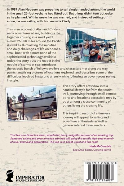 In 1987 Alan Nebauer was preparing to sail single-handed around the world in the small 25-foot yacht he had fitted out. But things didn’t turn out quite as he planned. Within weeks he was married, and instead of setting off alone, he was sailing with his new wife Cindy. This is an account of Alan and Cindy’s early adventures at sea, getting to know each other and building a life together cruising in a small yacht almost 25,000 miles around the Pacific. As well as illuminating the minutiae and daily challenges of life on board a small boat with almost none of the sophisticated technology available today, the story puts the reader in the middle of storms at sea; introduces the eclectic bunch of fellow travellers and characters they met along the way; paints tantalising pictures of locations they explored; and describes some of the difficulties involved in starting a family while following an adventurous roving lifestyle. This story offers a window into a nautical lifestyle far from the tourist trail, journeying through small, remote ports and locations accessible only by boat among a close community of others living the cruising life. This inspiring record of a timeless journey will appeal to sailing and adventure enthusiasts as well as general interest travel readers. Before Alan Nebauer was a celebrated solo ocean racer, he was a cruiser and adventurer, who with his new wife Cindy set off to cross the Pacific aboard a simple, 25-foot sloop. The Sea is so Great is the story of that voyage, and its return to Australia, and is a warm, wonderful, funny, insightful account of that amazing trip. Along the way, the Nebauers meet saints and scoundrels, are tested equally by storms and calms, and venture onward even when their pockets are empty, seemingly on their strong faith alone. Seasoned sailors and even armchair admirals will enjoy this terrific high-seas memoir of love, drama and exploration. The Sea is so Great is just one fine read. — Herb McCormick, Executive Editor, Cruising World magazine