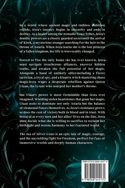 The Sea of Silver Grass is a romantic high fantasy that focuses on Jesra, the missing heir of Astaria. Alongside Kirek, a handsome man of mystery, she must navigate chaos magic and political intrigue to regain her throne.
