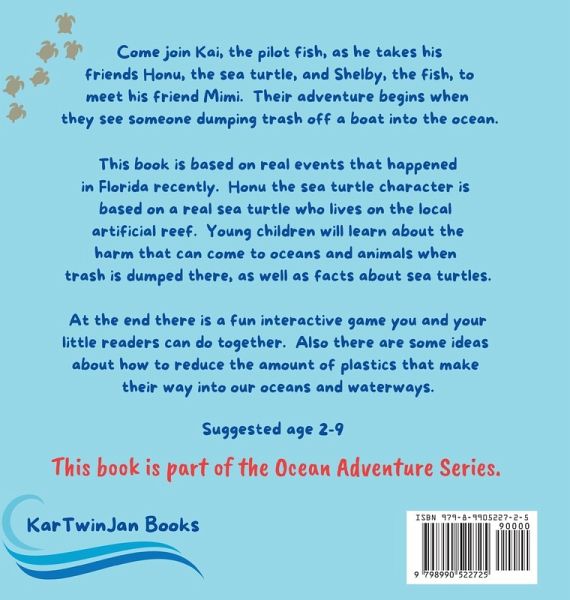 Come join Kai, the pilot fish, as he takes his friends Honu, the sea turtle, and Shelby, the fish, to meet his friend Mimi. Their adventure begins when they see someone dumping trash off a boat in the ocean. This book is based on real events that happened in Florida recently. Honu the sea turtle character is based on a real sea turtle who lives on the local artificial reef. Young children will learn about the harm that can come to oceans and animals when trash is dumped there, as well as facts about sea turtles. At the end there is a fun interactive game you and your little readers can do together. Also there are some ideas about how to reduce the amount of plastics that make their way into our oceans and waterways.