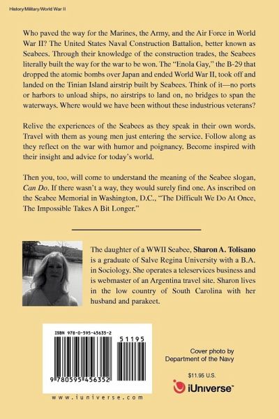 Who paved the way for the Marines, the Army, and the Air Force in World War II? The United States Naval Construction Battalion, better known as Seabees. Through their knowledge of the construction trades, the Seabees literally built the way for the war to be won. The "Enola Gay," the B-29 that dropped the atomic bombs over Japan and ended World War II, took off and landed on the Tinian Island airstrip built by Seabees. Think of it-no ports or harbors to unload ships, no airstrips to land on, no bridges to span the waterways. Where would we have been without these industrious veterans? Relive the experiences of the Seabees as they speak in their own words. Travel with them as young men just entering the service. Follow along as they reflect on the war with humor and poignancy. Become inspired with their insight and advice for today's world. Then you, too, will come to understand the meaning of the Seabee slogan, Can Do. If there wasn't a way, they would surely find one. As inscribed on the Seabee Memorial in Washington, D.C., "The Difficult We Do At Once, The Impossible Takes A Bit Longer."