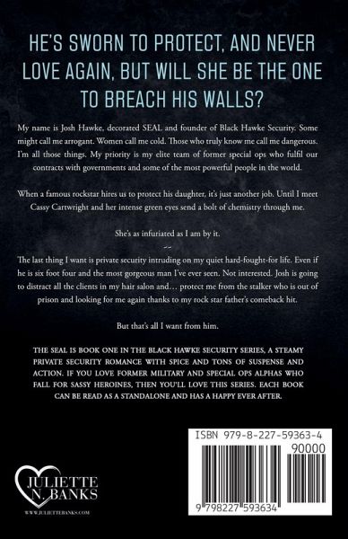 He's sworn to protect, and never love again, but will she be the one to breach his walls? My name is Josh Hawke, decorated SEAL and founder of Black Hawke Security. Some might call me arrogant. Women call me cold. Those who truly know me call me dangerous. I'm all those things. My priority is my elite team of former special ops who fulfill our contracts with governments and some of the most powerful people in the world. When a famous rockstar hires us to protect his daughter, it's just another job. Until I meet Cassy Cartwright and her intense green eyes send a bolt of chemistry through me. She's as infuriated as I am by it. The last thing I want is private security intruding on my quiet, hard-fought-for life. Even if he is six foot four and the most gorgeous man I've ever seen. Not interested. Josh is going to distract all the clients in my hair salon and...protect me from the stalker who is out of prison and looking for me again thanks to my rock star father's comeback hit. But that's all I want from him. Black Hawke Security is a steamy private security romance with spice and tons of suspense and action. If you love former military and special ops alphas who fall for sassy heroines, then you'll love this series. Each book can be read as a standalone and has a happy ever after.