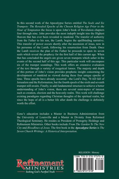 In this second work of the Apocalypse Series entitled The Seals and Six Trumpets: The Revealed Epochs of the Chosen Religion Age Prior to the Hour of Temptation the focus is upon John's book of Revelation chapters four through nine. John provides the most indepth insight into the Highest Heaven that has ever been revealed to mankind. The transfer of authority from the Father to his son, the Lamb, begins the spellbinding narrative. This transfer of power occurs shortly after the ascension of Jesus, now in his personna of the Lamb, following his resurrection from Death. Once the Lamb receives the plan of the Father he proceeds to open its seven seals which reveal the prophecy for the first half of this current age. When that has concluded the angels are given seven trumpets which usher in the events of the second half of this age. This particular work will encompass six of the trumpet soundings. This work offers an extensive evaluation of the text through a variety of exegetical lenses. The majesty and depth of this portion of John's vision provides prophetic insight concerning the development of mankind as viewed during these four unique epochs of time. Three epochs have already occurred-the Lord's Day, 70 AD fall of Jerusalem and the Reformation, but the fourth epoch of the sixth and seventh trumpet still awaits. Finally, to add fundamental structure to achieve a better understanding of John's vision, there are several mini-topics of interest such as creation, election and the heavenly realm. This work will challenge existing paradigms regarding Christian thoughts of the spiritual realm, but since the hope of all is a better life after death the challenge is definitely worth the effort.