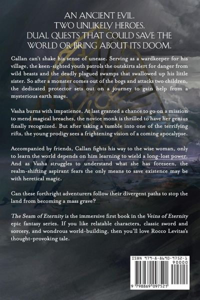An ancient evil. Two unlikely heroes. Dual quests that could save the world or bring about its doom. Callan can't shake his sense of unease. Serving as a wardkeeper for his village, the keen-sighted youth patrols the outskirts alert for danger from wild beasts and the deadly plagued swamps that swallowed up his little sister. So after a monster comes out of the bogs and attacks two children, the dedicated protector sets out on a journey to gain help from a mysterious earth mage. Vasha burns with impatience. At last granted a chance to go on a mission to mend magical breaches, the novice monk is thrilled to finally have her genius recognized. But after taking a tumble into one of the terrifying rifts, the young prodigy sees a frightening vision of a coming apocalypse. Accompanied by friends, Callan fights his way to the wise woman, only to learn the world depends on him learning to wield a long-lost power. And as Vasha struggles to understand what she has foreseen, the realm-shifting aspirant fears the only means to save existence may be with heretical magic. Can these forthright adventurers follow their divergent paths to stop the land from becoming a mass grave? The Seam of Eternity is the immersive first book in the Veins of Eternity epic fantasy series. If you like relatable characters, wondrous world-building, and unique takes on the hero's journey, then you'll love Rocco Levitas's thought-provoking tale.